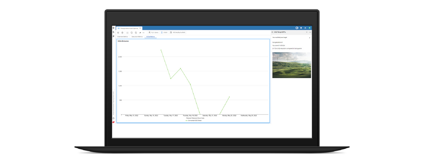Pour réduire les émissions de carbone, TLO regroupe automatiquement les expéditions, ce qui nécessite moins de camions. Les utilisateurs maximisent l'utilisation des actifs et réduisent les émissions de carbone de plus de 20 %.