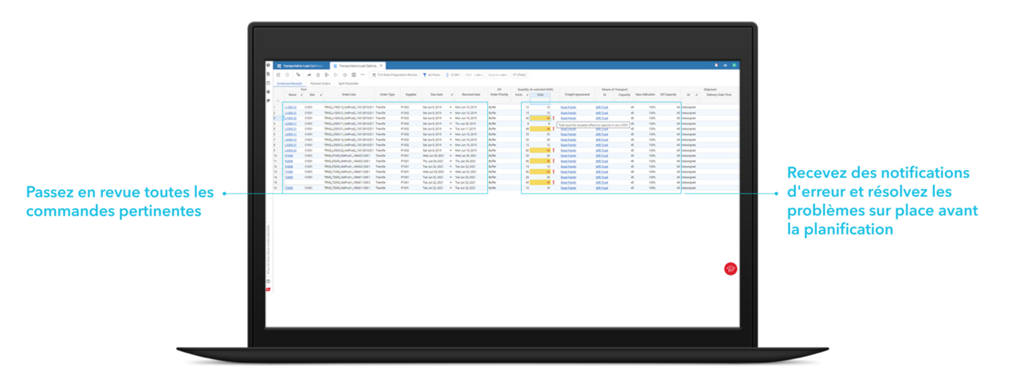 - Optimisez et planifiez les commandes en chargements physiques tout en tenant compte automatiquement des contraintes réelles du réseau d'approvisionnement telles que la capacité, la disponibilité des matériels et l'horizon de planification