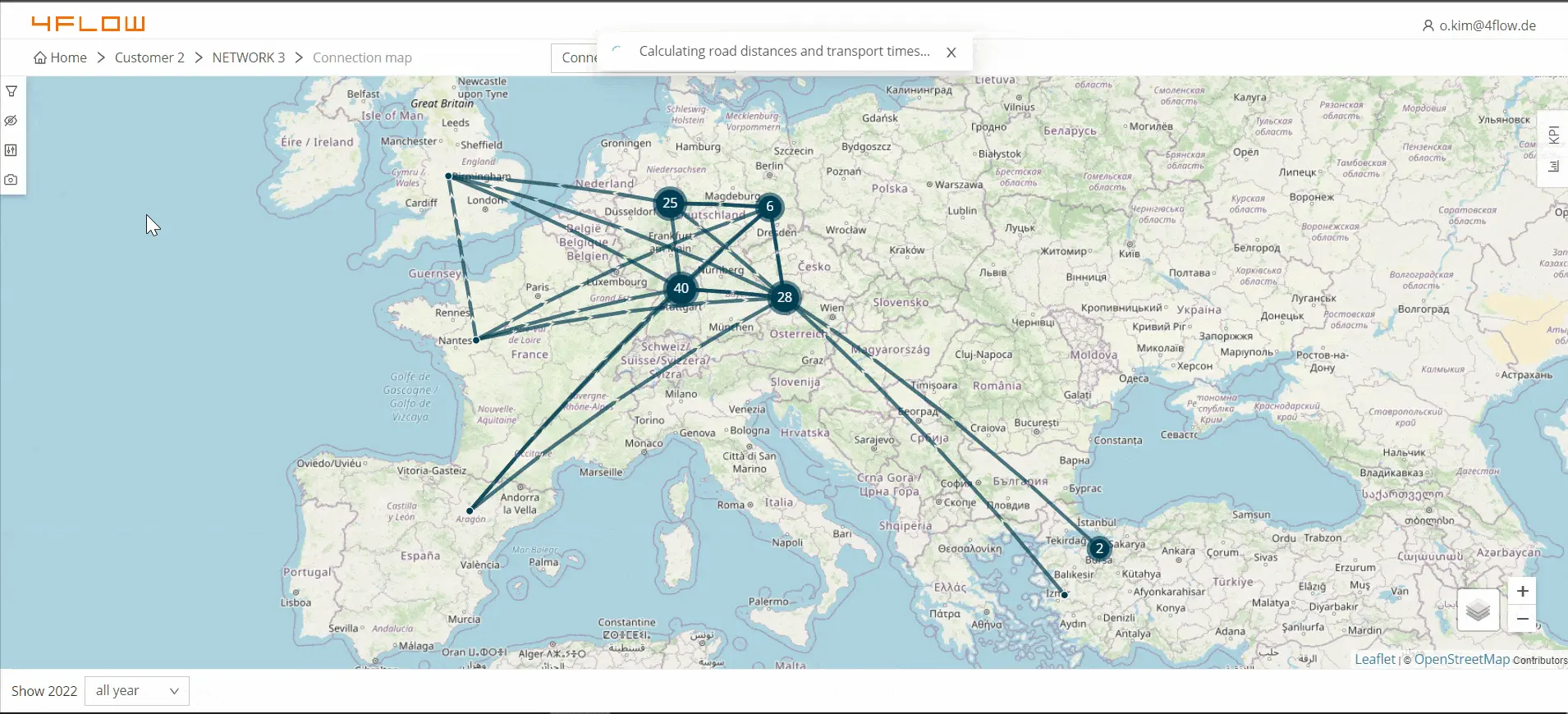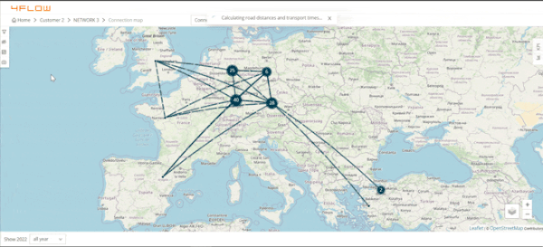Sur la base des données téléchargées, 4flow VIA® va géolocaliser les sites de votre réseau. Les coordonnées géographiques sont ensuite utilisées pour calculer la distance (routière ou aérienne) et le temps de transport entre les sites.